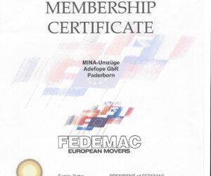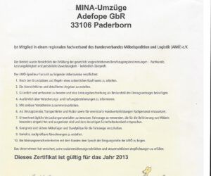 MINA-Umzüge wird als ordentliches Mitglied der Fachvereinigung Möbelspedition (AMÖ) aufgenommen. Hiermit erbringen wir einen weiteren Qualitätsnachweis in der Durchführung unserer Umzüge. Die Mitglieder des Bundesverbandes haben sich verpflichtet, nach einem Verhaltenskodex zu arbeiten, der dem Sicherheitsbedürfnis der Umzugskunden entgegenkommt.